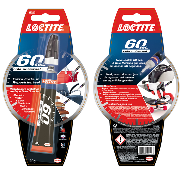 Uso Indicado Couro, borracha, madeira, metal, porcelana, papel e plástico. Quando tiver um minuto. Resolva até mesmo os grandes reparos com a nova Cola Universal Loctite 60 sec. É rápida, forte e reposicionável. Para resultados perfeitos em apenas 60 segundos.
